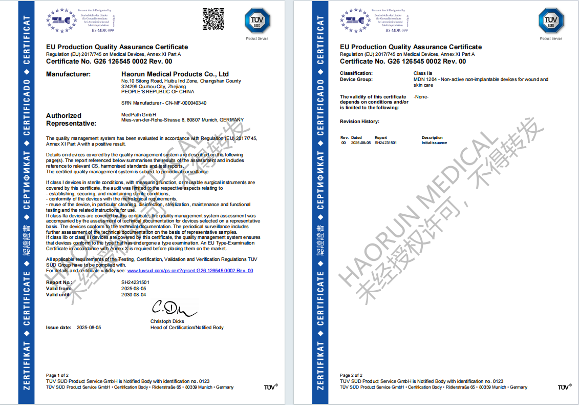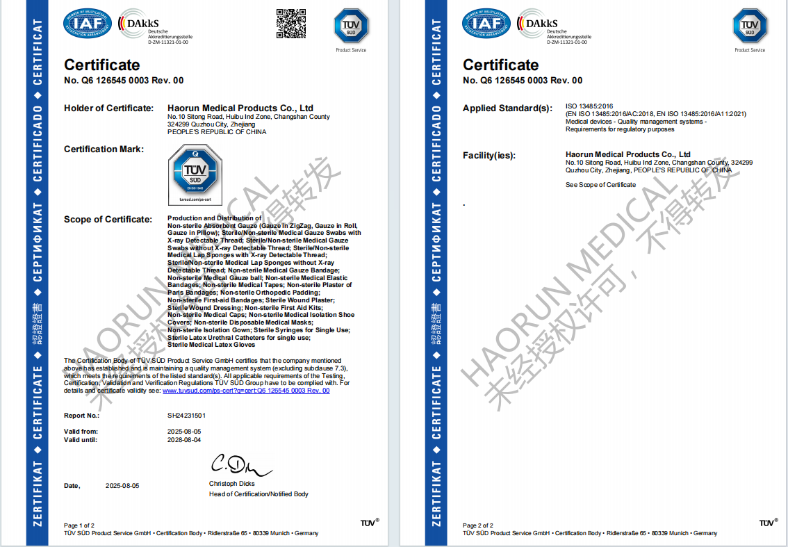 Keyfiyyətimizi daha da inkişaf etdirmək üçün, 2023-cü ilin sentyabrında keyfiyyətli dərslik sənədlərimizin və prosedur sənədlərimizin dərcini başa çatdırdıq. Buna əsasən, 2024-cü ilin yanvar ayında keyfiyyət idarəetmə sistemimizi inkişaf etdirdik, MDR ilə əlaqəli məzmun əlavə etdik. 10 aprel 2025-ci ildə və sonra ikinci mərhələdə Tuv Sud yoxlamasının birinci mərhələsini keçdik. Nəhayət, bu ilin avqust ayında sertifikat nömrəmizi Haorun Tibbi keyfiyyət idarəetmə sistemində yeni bir addım ataraq və şirkətin İnkişaf Fondunun gücləndirilməsi üçün bildirilmiş orqan sistemində görünüşə çevrildi. Birdəfəlik tibbi istehlak materiallarımız (jaze, cauze rulonları, jukoz bandajlar və s.) Dünyada müştərilərə üstün məhsul keyfiyyəti və xidməti ilə müştərilər təqdim edir.