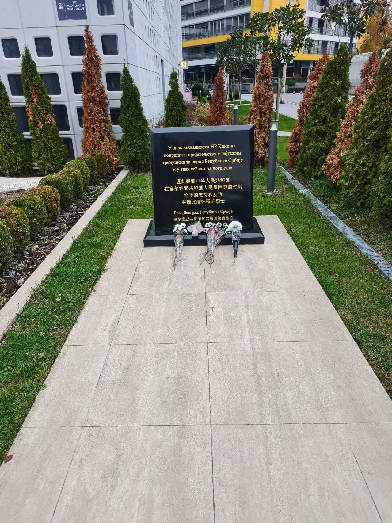 Saytda komanda üzvləri təntənəli şəkildə “Şəhidləri ehtiramla, sülhü əzizlə” yazılmış abidənin önündə dayanaraq keçmişə nəzər salıblar. Böhran zamanlarında Çin və Serbiya arasında ortaq əlaqəni qeyd edən Çin və Serb mətnləri ilə həkk olunmuş qara abidə təzə çiçəklər və Çin milli bayraqları ilə əhatə olunmuşdu. "Burada olmaq sülhün dəyərini daha da hiss edir" deyə komanda lideri qeyd edib. “Bu şəhidlərin canları ilə qoruduqları əmin-amanlıq bizim tibb işçiləri kimi həyatlarını qorumaq missiyamızın əsasını təşkil edir”.
